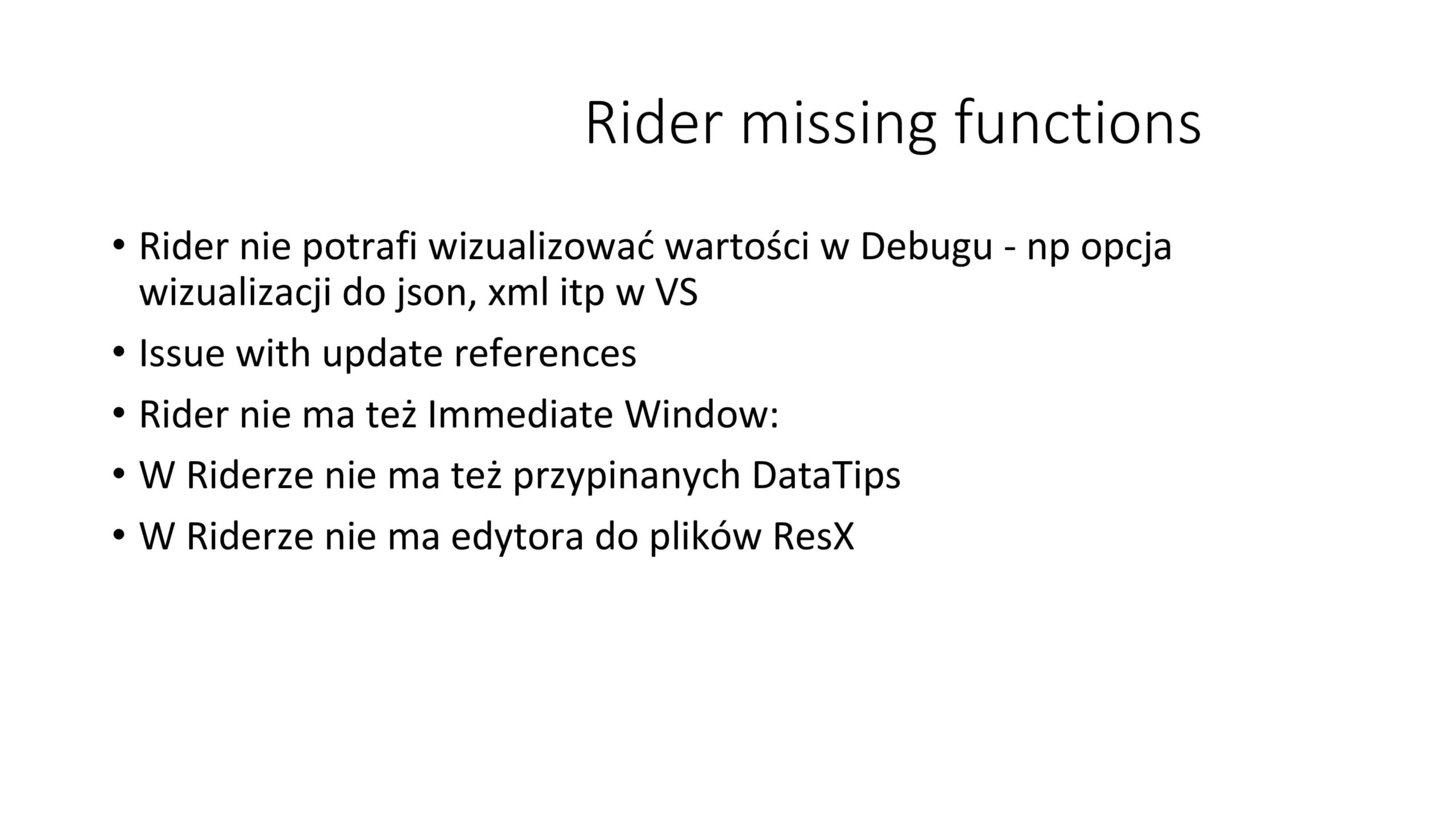 Oczywiście Rider nie jest bez wad. Po kilku dniach znaleźliśmy błąd w aktualizacji referencji do serwisów. Dla części osób uciążliwe jest kilka braków. Rider nie ma tzw. okna bezpośredniego (ang: „Immediate window”) przy debugowaniu, jak i etykiet danych (ang. „Data tips”). Najbardziej dokuczliwy wydaje się jednak brak edytora do plików resx. Nad tym ostatnim Rider pracuje, jednak przez 4 lata nie dostało to właściwego priorytetu.