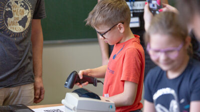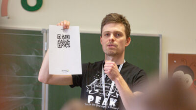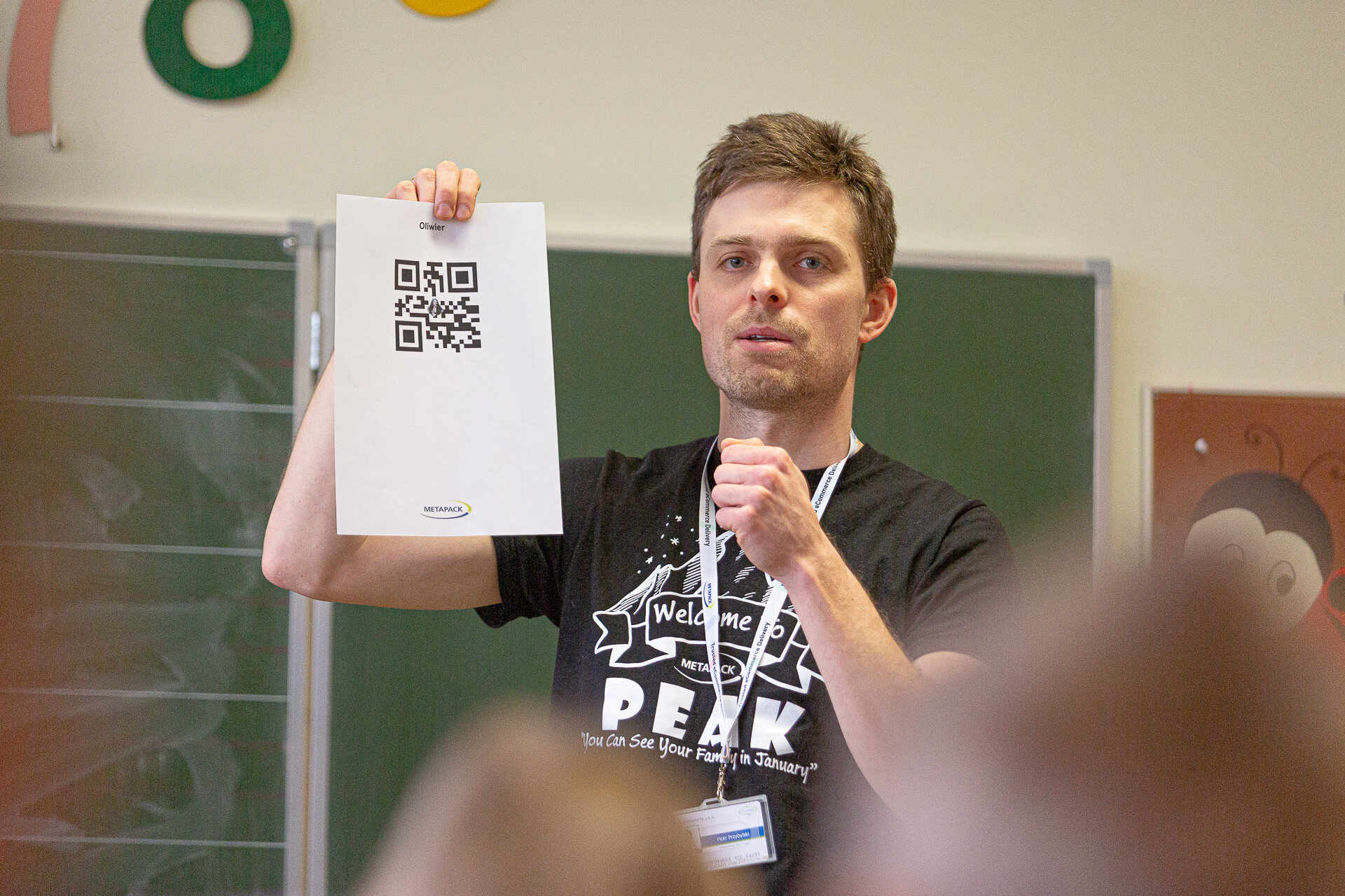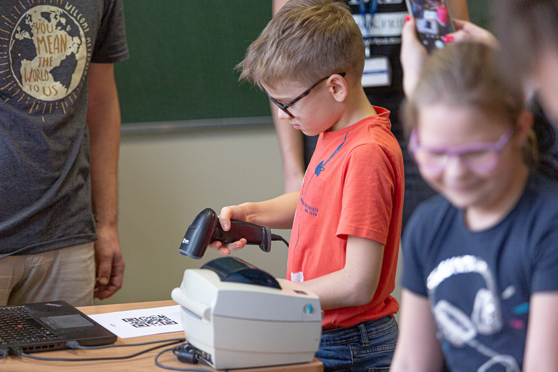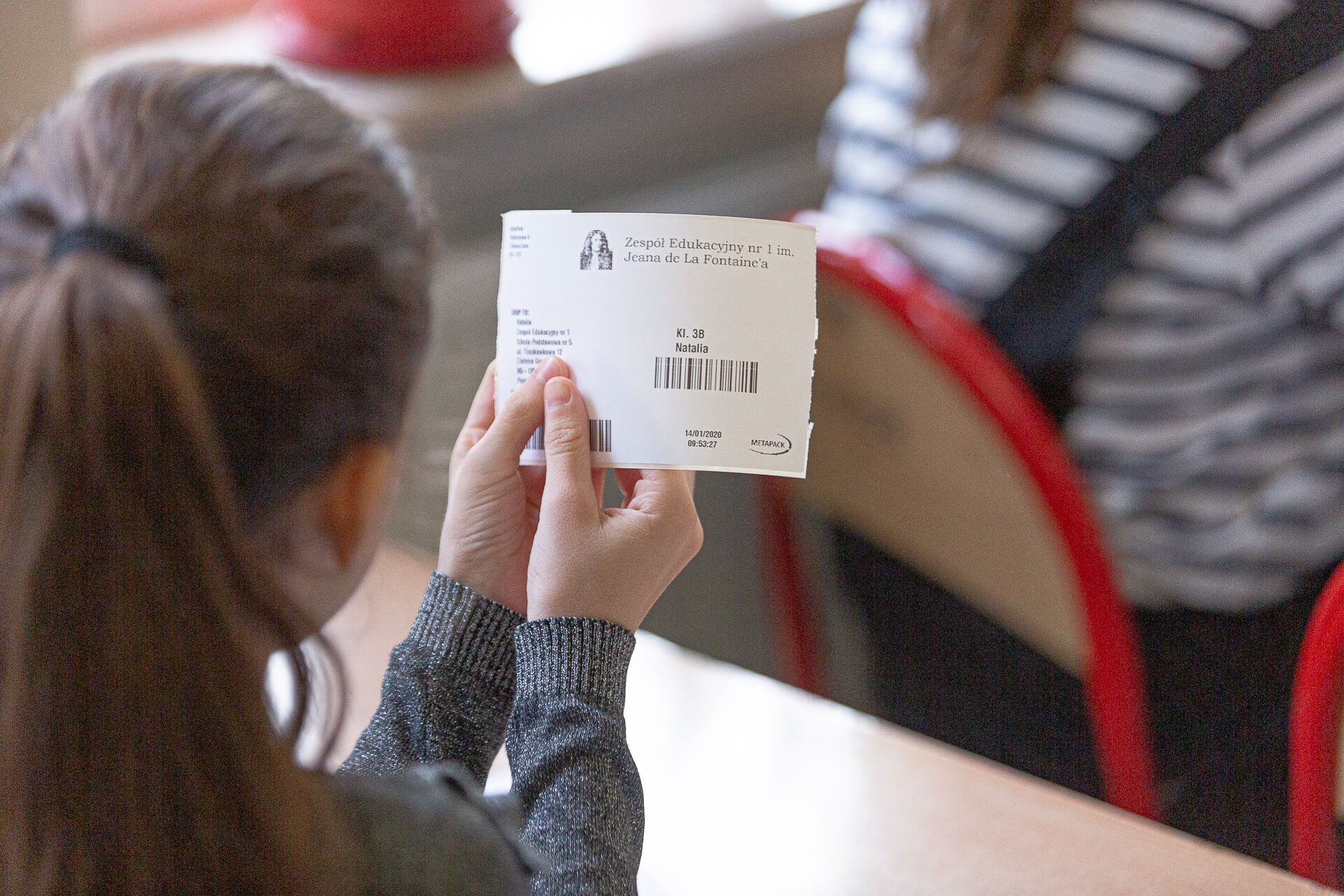 Piotr: The children received special QR codes with their names previously coded. Their task was to scan their code with our scanner, which automatically transferred data to the thermal printer and printed the label. This label contains all coded information with the school’s address and the child’s name. Each student could take such a label, stick it somewhere at home and scan it with his or her phone at any time.